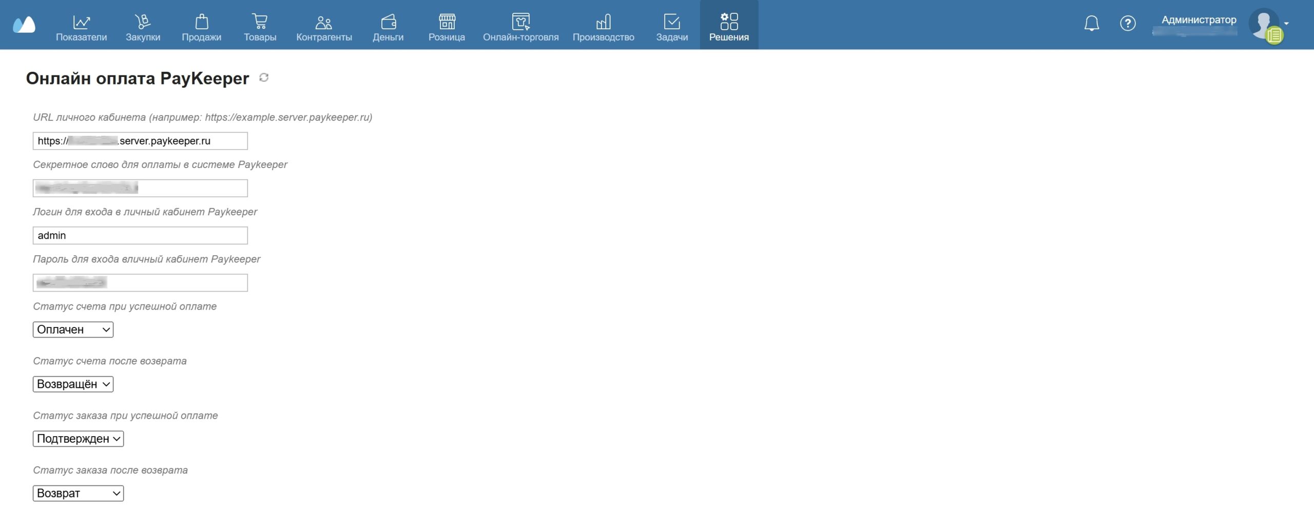 Установите «URL, на который будут отправляться POST-запросы» — https://moysklad.paykeeper.ru/callback.