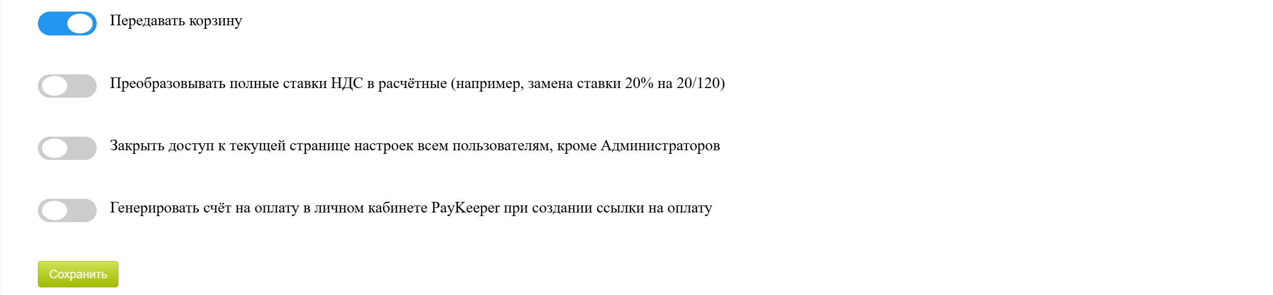 Передавать корзину. Если опция активна, то в корзине будут указаны товарные позиции для чека.