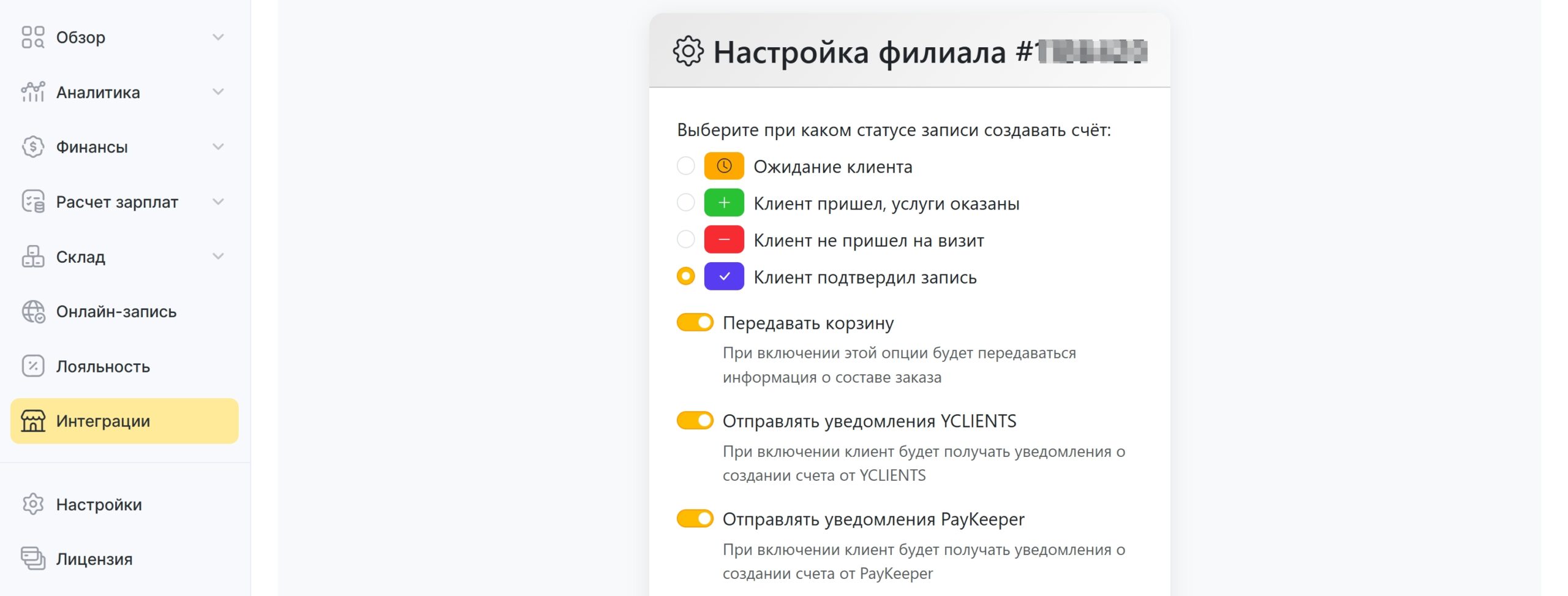 4.2. Если статус записи изменится на тот, что был настроен в главе 2 настоящей инструкции, то будет автоматически сгенерирован счёт в личном кабинете PayKeeper. Например, если в настройках выбран статус «Клиент подтвердил запись», то счёт на оплату будет создан после подтверждения записи. Подтверждение записи может сделать покупатель в приложении YCLIENTS, либо сотрудник в кабинете YCLIENTS.